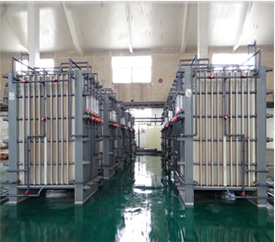 該裝置是由一定數量的膜組成的一系列結構單元;其中每個單元有一張陰離子均相膜隔開成滲析室和擴散室,采用逆流操作,在陰離子均相膜的兩側分別通入廢酸液及接受液(自來水)時,廢酸液側的酸及其鹽的濃度遠高于水的一側,根據擴散滲析原理,由于濃度梯度的存在,廢酸及其鹽類有向擴散室滲透的趨勢,但膜對陰離子具有選擇透過性,故在濃度差的作用下,廢酸側的陰離子被吸引而順利地透過膜孔道進入水的一側。同時根據電中性要求,也會夾帶陽離子,由于H+的水化半徑比較小,電荷較少;而金屬鹽水化半徑較大,電荷較多,因此H+會優先通過膜,這樣廢液中的酸就會被分離出來。