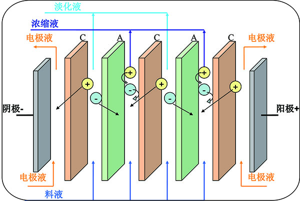 電驅動膜分離器由隔板、電驅動膜、電極、夾緊裝置等主要部件組成。電驅動膜對不同電荷的離子具有選擇透過性。陽膜只允許通過陽離子,阻止陰離子通過;陰膜只允許通過陰離子,阻止陽離子通過。在外加直流電場的作用下,水中離子作定向遷移。由于電驅動膜分離器是由多層隔室組成,故淡室中陰陽離子遷移到相鄰的濃室中去,從而使含鹽水淡化。
